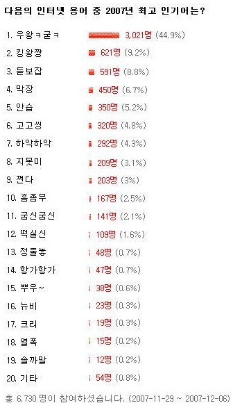 1. 우왕 ㅋ 굳 ㅋ <- 디씨에서 시작된..좋단소리죠. ㅋㅋ 우와~ 굿이라고. ㅋㅋ 2. 킹왕짱 <- King王짱. 최고란 소리죠. ㅋㅋ 3. 듣보잡 <- 몰라용;; 4. 막장 <- 설명할려니 이것참.. 인생막나가는다는거랑 비슷한데.. 암튼.. 뭐 좋은뜻은 아닌... ex) 36살먹도록 직장하나 없으면 막장인가효? 이런.. 5, 안습 <- 안구에 습기찬단 소리. 눈물난단 소리죠. ㅋ 6. 고고씽 <- 다들 아실듯;; 7. 하악하악 <- 거친숨소리. 뭐.. 변태나.. ㅋㅋㅋ 8. 지못미 <- ▷◁ 000 지켜주지 못해 미안해. 누군가의 안타까운 사연을 들으면 예의상 쓰는말이죠.. 9. 쩐다. <- 소금에 쩐다랑 비슷한데.. 좋은뜻 나쁜뜻 다 쓰이는..엄청난 작품을 봐도 쩐다라고 쓸수있고.. 개판인걸봐도 쩐다란 말을 쓸수있는.. 뭐. 쓰기나름. 10. 흠좀무 <- 뭘까용? 11. 굽신굽신 <- 말그대로 굽신거림.. 12. 떡실신 <- 그냥 실신이 아니고 ‘떡’이 될정도로 실신한다는거죠. 깡렬한 표한. ㅋ 13. 정줄놓 <- 정신줄 놓았냐? 뭐. 개념이 안드로메다로 간거랑 비슷.. 14. 항가항가 <- 뭘까용;; 15. 뿌우~ <- 민지라는 어떤분이 쓰던.. “민지 와써염 뿌우~ ‘ㅅ’” 16. 뉴비 <- 새로운 사람이요. 첨뵙겠습니다_(내가아는거랑 맞는건가.. 헷갈리네;;) 17. 크리 <- 크리티컬. 깡렬한거죠. 뭐. 예로는... 안습크리 정도.. 18. 열폭 <- 뭐지.. 19. 솔까말 <- 뭘까요.. 대충 솔로는 으로 시작하는거 같은데;; 모르는게 많군요.. 크솔뭐(크리스마스때 솔로는 뭐하지?), 여병추(여기 병진(신) 하나 추가요~) 등은.. 순위권이 아니군요.. 크흙... ㄷㄷㄷ은 덜덜덜 입니다. ㅋㅋ