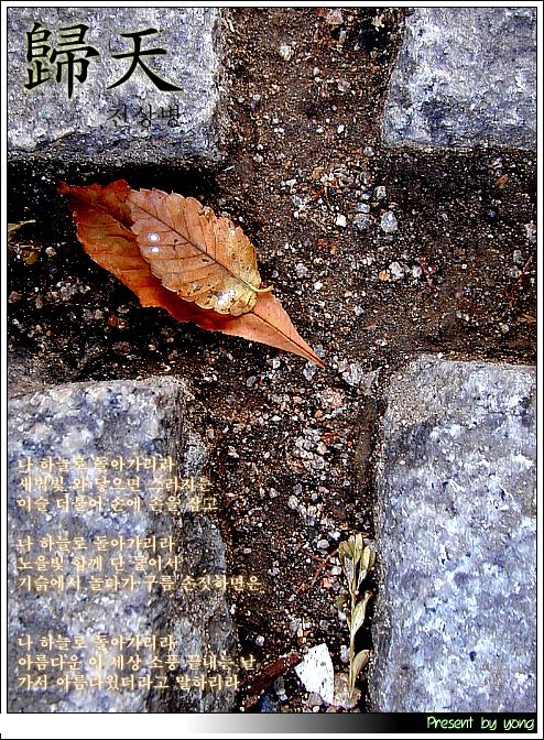 이 시는 천상병(1930~1993) 시인이 1979년에 발표한 ?귀천(歸天)?의 전문이다. 이 시를 읽다보면 시인의 심성이 얼마나 아름다운가를 알게 된다. 본래 천상의 존재였는데 잠시 지상에 소풍 와서 아름다운 아내(문순옥)와 결혼(43세, 1972)하고 재미있게 놀다가 다시 꿈에서 깨어나듯이 돌아간다는 생각을 바탕으로 하고 있다. 김만중이 쓴 『구운몽』의 주인공 성진이가 잠시 꿈속에서 지상에 내려와서 8선녀와 희희낙락 노닐다가 돌아가는 것과 같은 것으로 생각하고 있다.