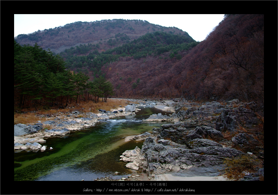 그 오묘한 경계선상에서 이처럼 아름다운 풍경을 보게되었습니다. 시리도록 푸른계곡물과, 붉다못해 자줏빛으로 물들어가는 산하, 사철 푸르름을 보여주는 소나무의 경이로운 색채까지....