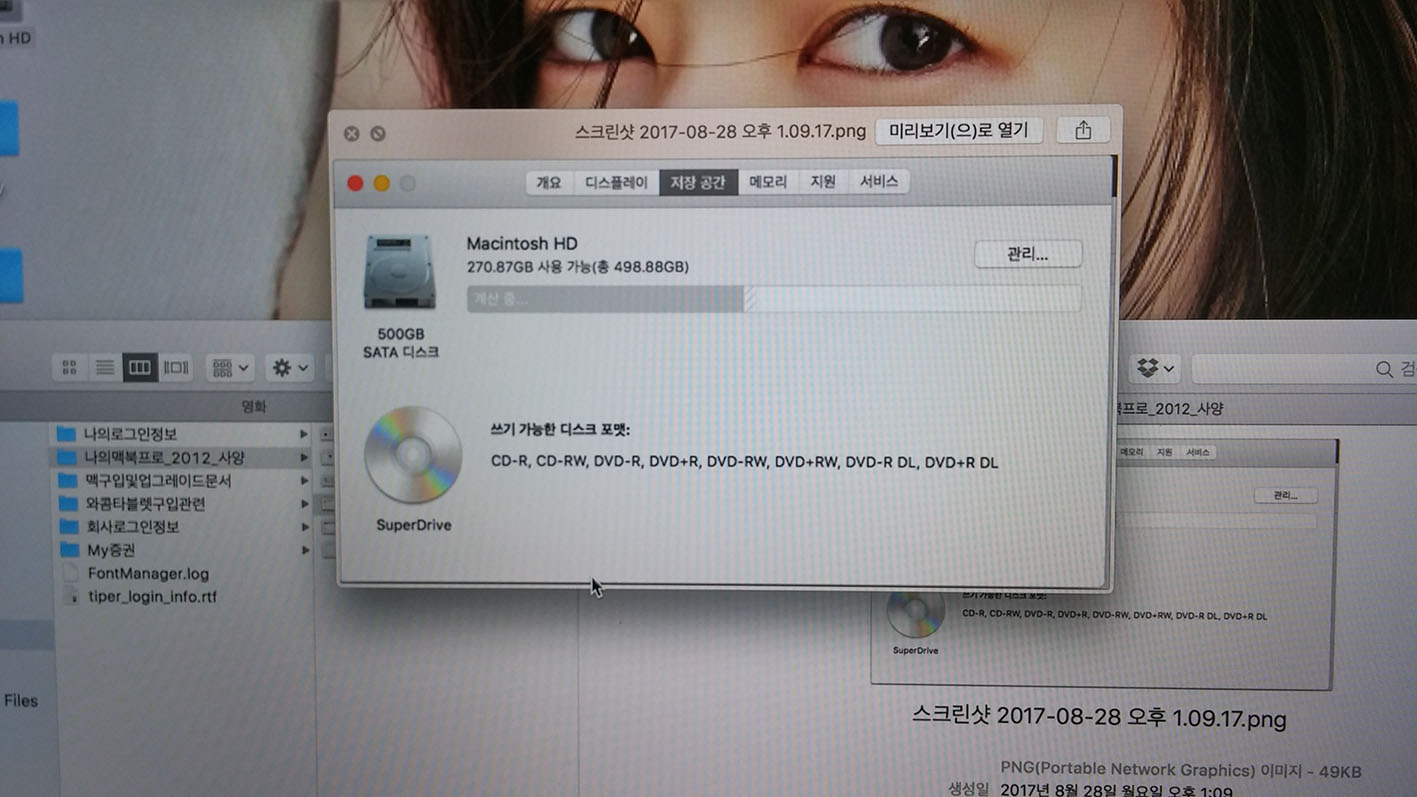 맥북프로 cpu 2.5기가, 인텔 i5, 램 8기가(업그레이드), 하드디스크 500기가