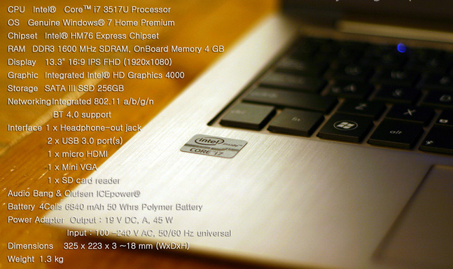 사양 : 윈도우7 Home Prem K /1.3kg/인텔 코어 i7/LED백라이트/13.3인치/256GB(SSD)