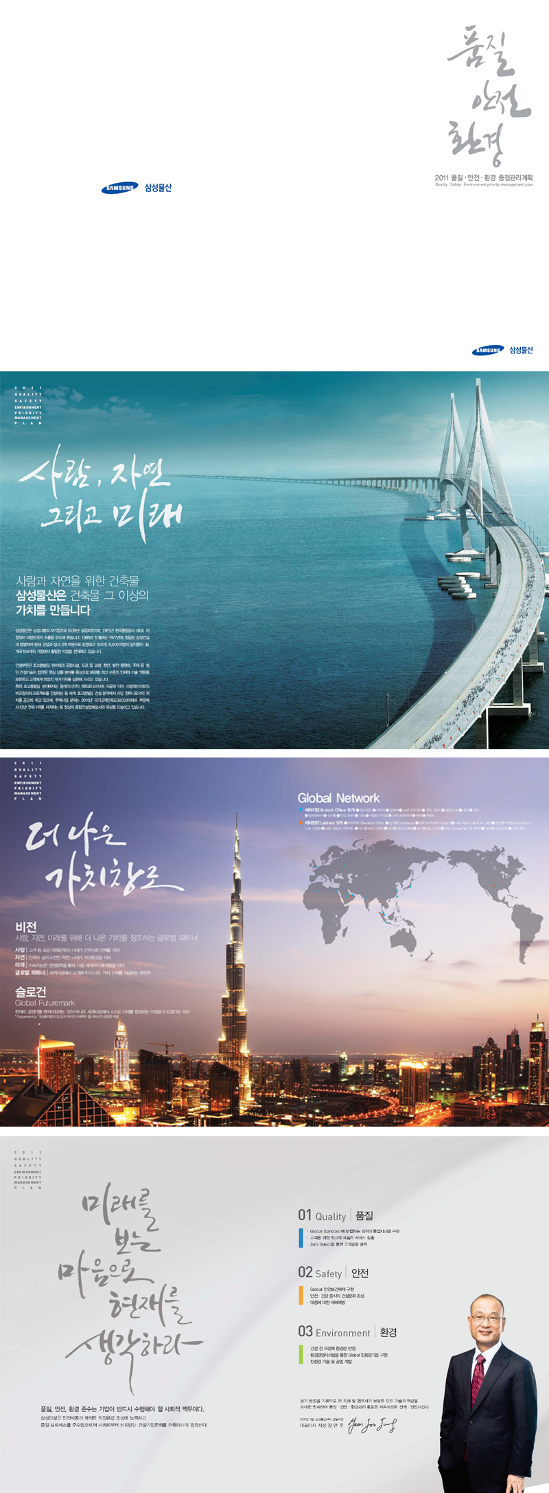 삼성물산 카달로그 캘리그라피_품질 안전 환경사람 자연 그리고 미래더 나은 가치창조미래를 보는 마음으로 현재를 생각하라
