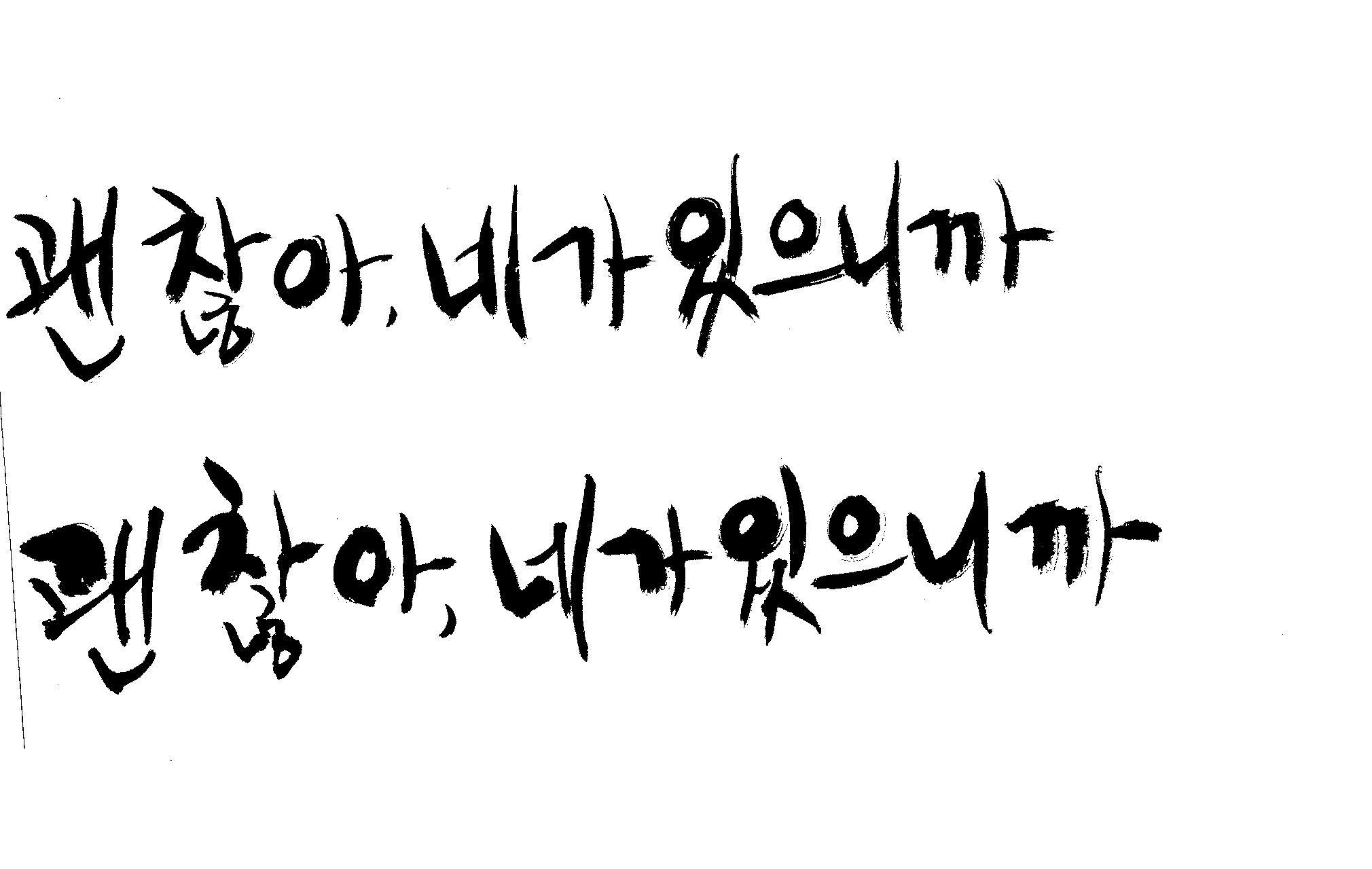 캘리 하나 부탁드릴께요. 김철호 일반 0 7094 2009.01.06 22:48 > > > > > 지금 작업중인 표지가있는데 > > > > 손글씨로 한번 작업해보려구요 > > > > 부탁드립니다. > > > > 괜 찮아, 네가 있으니까 > > >