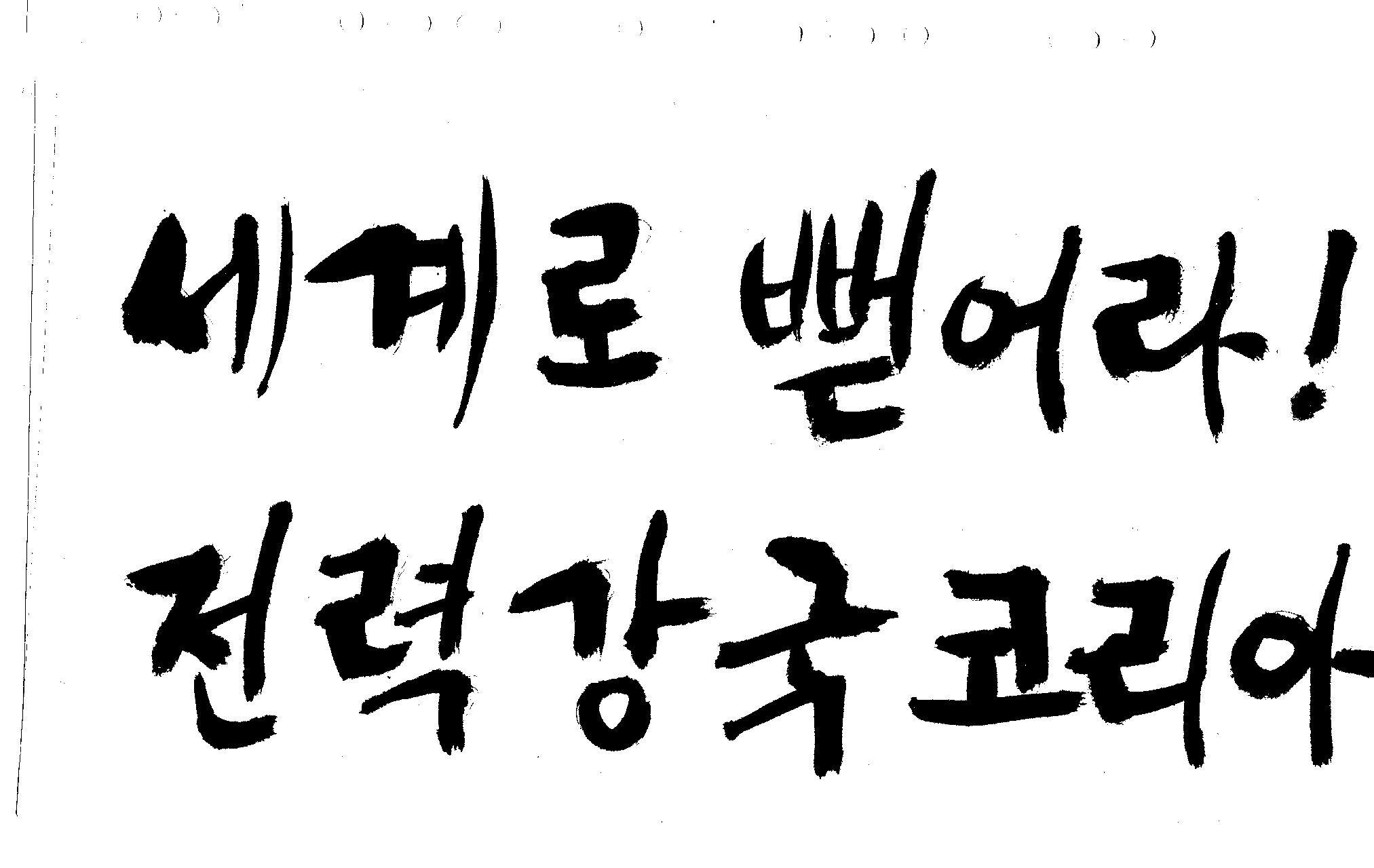 캘리 좀 부탁드려요!~ 김철호 일반 1 10748 2008.12.24 12:09 > > > > > 전력회사 신문광고를 하는데요 캘리로 멋지게 하고픈데 > > 캘리프로그램으로 아무리 써도 느낌이 안나옵니다 ㅜ.ㅜ > > 이런걸 부탁한다는 자체가 너무나도 염치없지만 부탁드립니다. > > > > 세계로 뻗어라! 전력강국 코리아 > > > 보기는 쉬워도 하기는 어려운게 > 세상 모든 일 일겁니다. > 그중에 캘리그라피가 그런것 일 겁니다... > 스캔중에 글꼴이 잘린것은 서로다른글꼴서 편집하시길... > 글수가 많아서 어쩔 수없네요... >