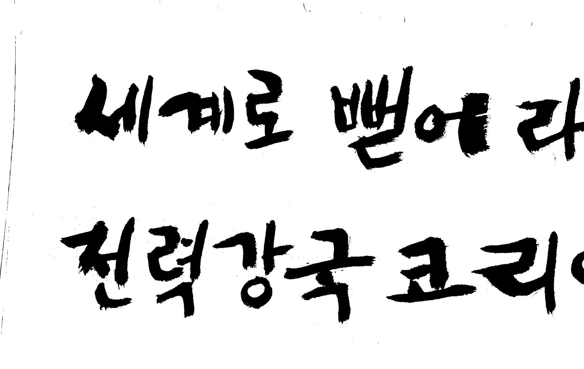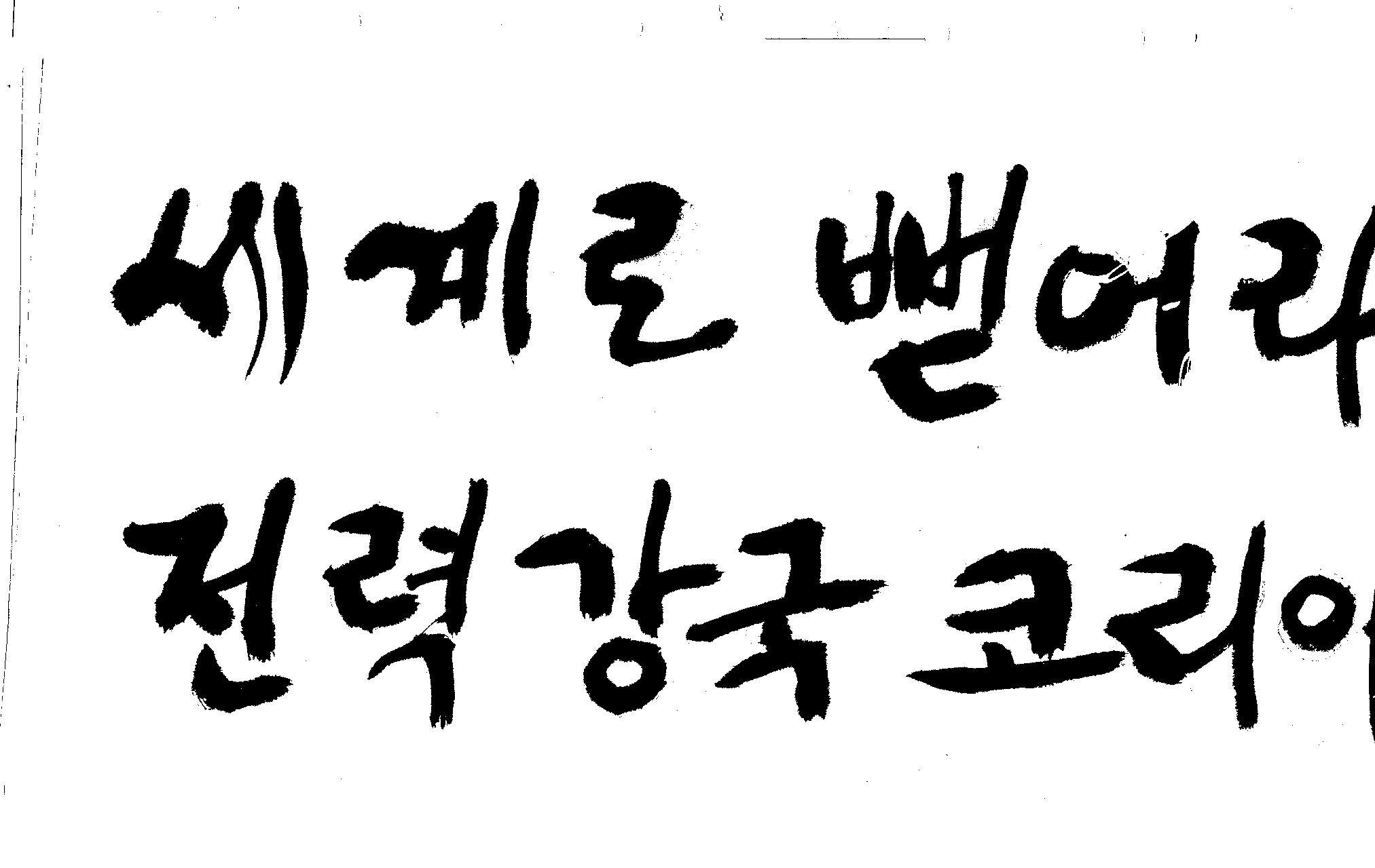 캘리 좀 부탁드려요!~ 김철호 일반 1 12824 2008.12.24 12:09 > > > > > > > > > 전력회사 신문광고를 하는데요 캘리로 멋지게 하고픈데 > > > 캘리프로그램으로 아무리 써도 느낌이 안나옵니다 ㅜ.ㅜ > > > 이런걸 부탁한다는 자체가 너무나도 염치없지만 부탁드립니다. > > > > > > 세계로 뻗어라! 전력강국 코리아 > > > > > 보기는 쉬워도 하기는 어려운게 > > 세상 모든 일 일겁니다. > > 그중에 캘리그라피가 그런 것일 겁니다... > > 스캔중에 글꼴이 잘린것은 서로다른글꼴서 편집하시길... > > 글수가 많아서 어쩔 수없네요... > > >