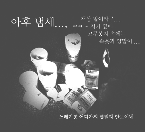 일단 오랜기간 밤샘을 하면 주변정리를 안하는거야..., 쓰레기도 암데나 막 버리면서...,