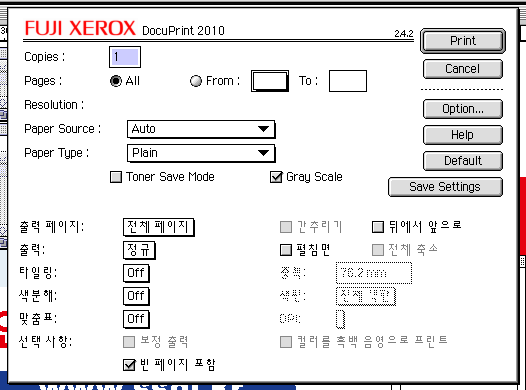 lee.m.k님께서 얘기하신대로 기존 시스템을 가지고 계신다면 한글시스템->프리퍼런스 에서 프린터 설정에 관련된 프리퍼런스 파일을 가져오셔서 대치하시는게 가장 좋으실꺼구요