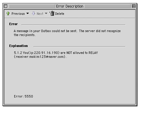 준도우미님의 말씀처럼 Outloox Express의 설정 내용 중에서 SMTP 서버와 관련된 항목들에서의 설정이 잘못되어 나타나는 증상일 수 있으며, 아니면 이메일을 수신하는 분의 이메일 주소가 잘못되어 나타나는 증상일 수도 있습니다.