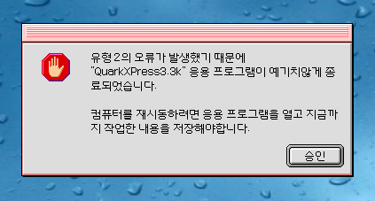 마지막 방법이 쿽3.3 실행아이콘을 정보입수해서 메모리에 들어가신다음 사용메모리를 150,000(150MB)정도로 올려주시고 쿽실행후 메뉴 파일에 열기를 실행해서 아래 특수하게 열기에 체크후 해당 파일을 강제오픈하면 물제가 있는 부분은 깨진상태로 오픈이 됩니다. 그다음 이어서 작업을 하시면 됩니다. ============================ 데이타복구(출장),맥A/S,맥구입 또는 인텔맥에 윈도우XP 설치가 필요하시면 위(베스트맥-A/S,판매)아이디를 클릭하고 자기소개를 참고해 주세요