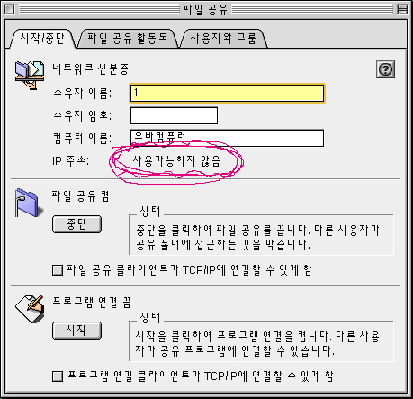 일단 한글 시스템 --> Preferences 폴더에서 Internet Preferences, TCP/IP Preferences 파일들을 찾아 휴지통에 버리신 후에, 조절판의 TCP/IP에서 DHCP 서버 사용하기로 맞추신 후에 인터넷 접속이 되는지 확인하여 보세요.
