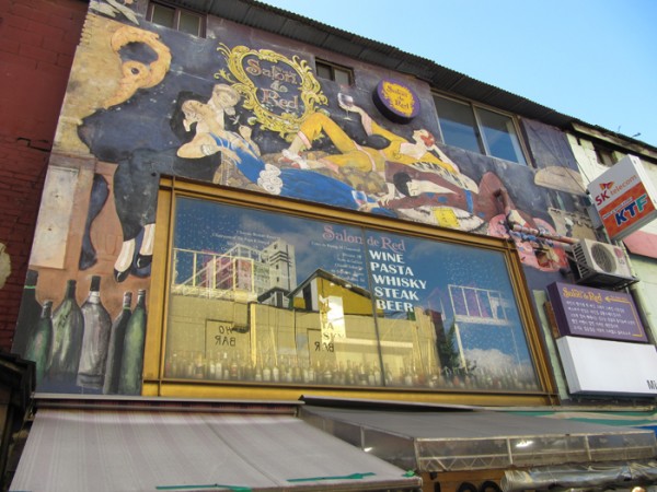 전철역에서 홍대 올라가는 골목과 놀이터 앞 고기집 벽면이다.
