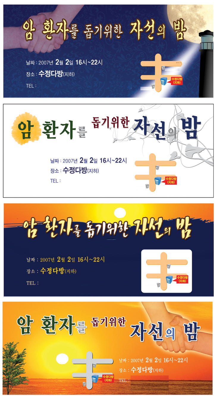 저도..다른건 일단 제쳐두고서라도.. 정말...서체들은...아니라고 생각됨. 빼다는..직접적으로 암투병하는 사진을 넣을게 아니라면... 사진이미지 말고.. 그냥 따뜻한 컬러로 백그라운드 넣는게 나을지도. 사진들이 왠지 조잡해 보이네요.