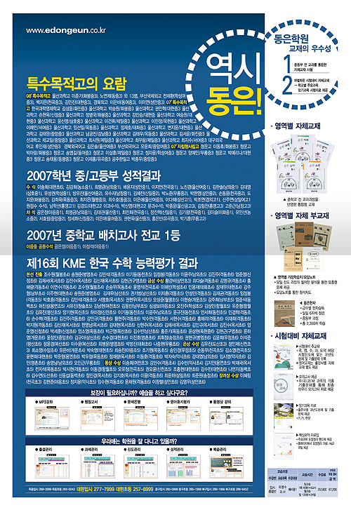 동은학원... 한참을 보고 있었네요. 전 회사에서 동은학원하고 거래 했었는데 엄청 까다로웠거든요~ 하나 고치고 웹하드 올려라~ 또 하나 고치고 웹하드 올려봐라~ 정말 피곤한 거래처였음. 전단 너무 깔끔하니 이쁘네요~ ^^
