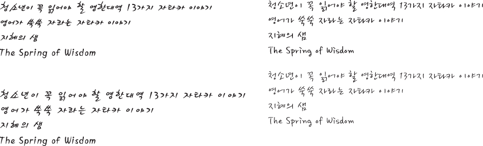 세종소주체, 봄날체로 좀 부탁드려용~~ Voyager 일반 0 3707 2009.01.19 19:00 -0001.11.30 00:00 vo.ai (0byte) + 31 > > 청소년이 꼭 읽어야 할 영한대역 13가지 자타카 이야기 > 영어가 쑥쑥 자라는 자타카 이야기 > 지혜의 샘 > The Spring of Wisdom > > 부탁드려용~~ >